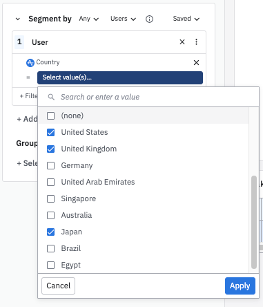 To filter on multiple values of the same property, add more values in the Select value(s)... box. This creates an OR clause in the segment’s definition. In the screenshot below, the segment now includes users who fired an event in the United States OR the United Kingdom OR Japan .