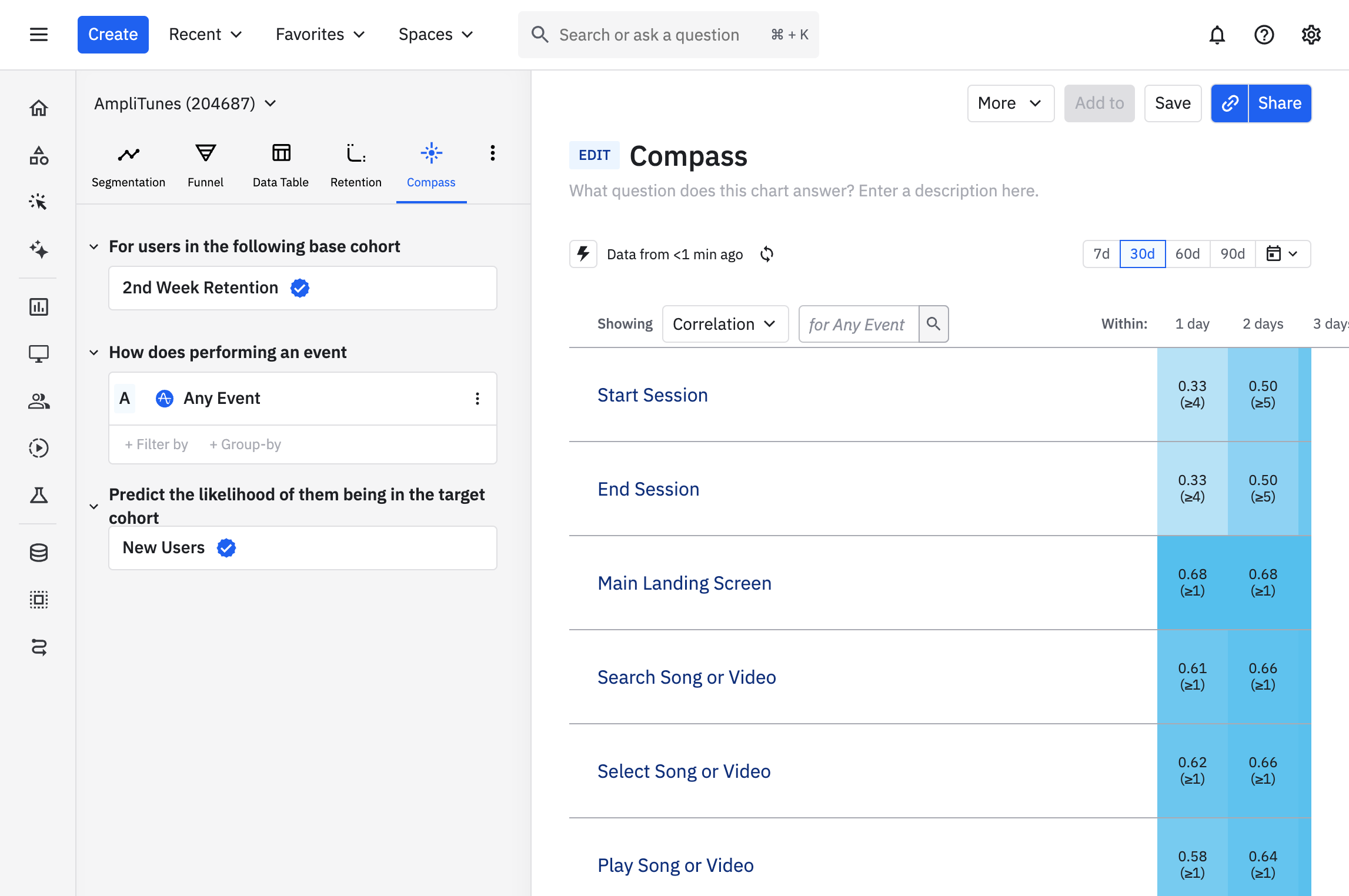 But if they also search for a song or video on that first day, they're much more likely to retain into the second week: the correlation rates between triggering those events on day 1 and sticking around for another week are 0.40 for starting a session, versus 0.72 for searching for a song. (We discuss correlation in the article on interpreting your Compass chart.)