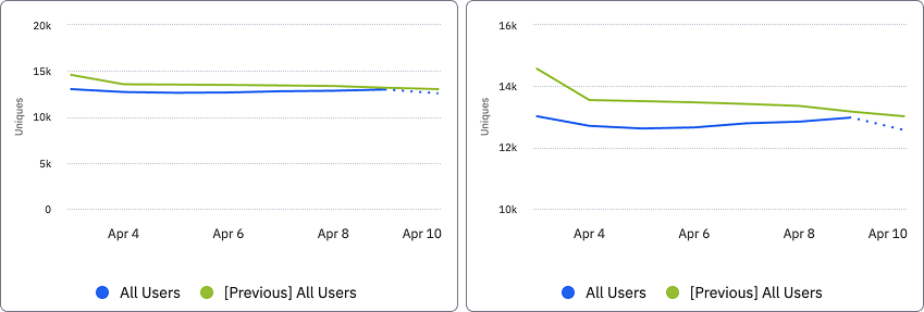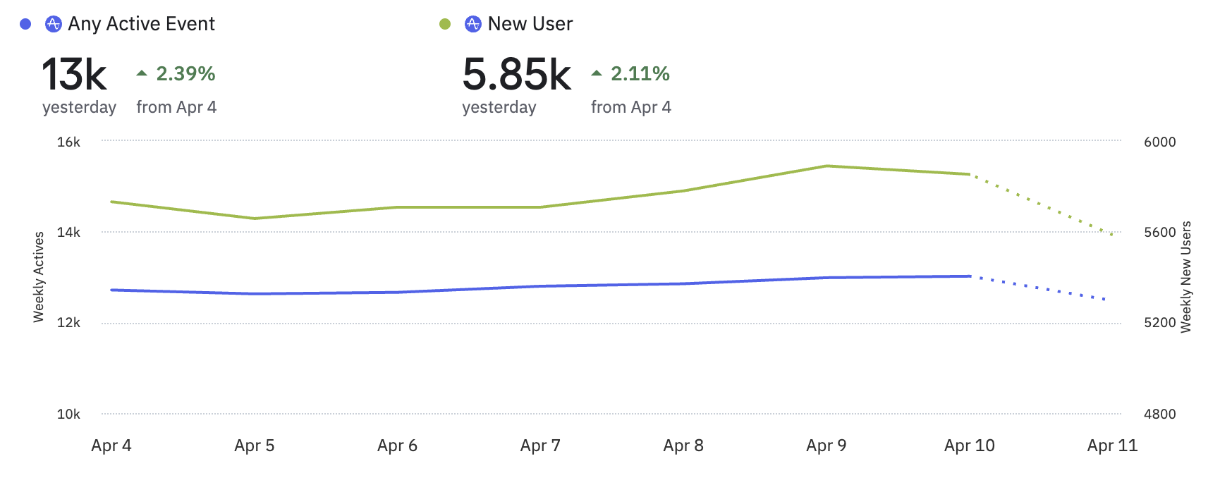 In this example, Weekly Active Users, measured by Any Active Event falls in the range of 12,000 - 13,500. Weekly New Users, has a range between 5500, and 6000. The addition of a second Y-axis ensures that both events display with enough granularity to observe increases and decreases over time.