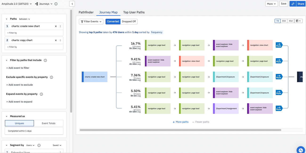The Journeys chart allows you to inspect your users’ product journeys in two ways: By the total number of unique users who took a particular path, or by the total number of times they opted for that path.