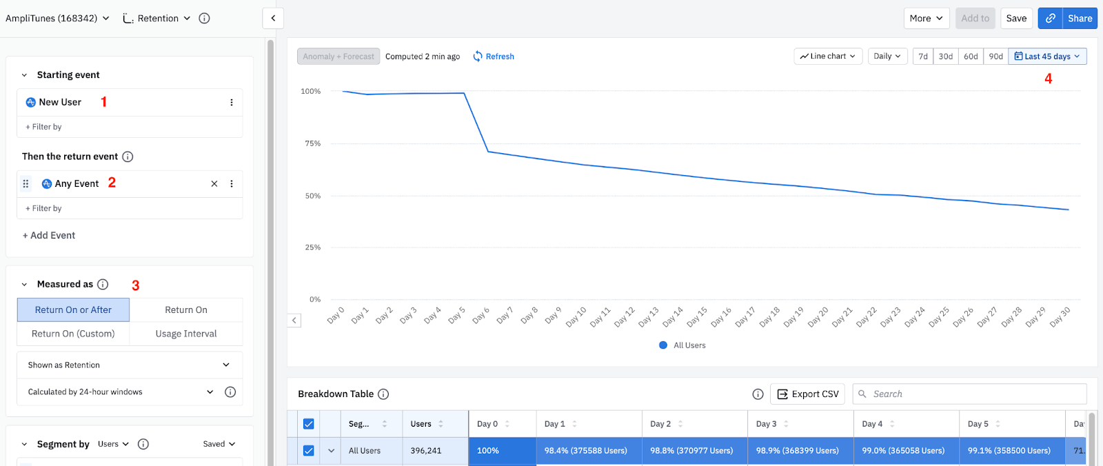 Interpreting your Retention Analysis chart is more straightforward than it may at first appear, mostly because you can read through the parameters like a sentence. For example, the following chart shows you (1) new users who came back and triggered (2) any event (3) on or after the first day of your retention analysis over (4) the last 45 days:
