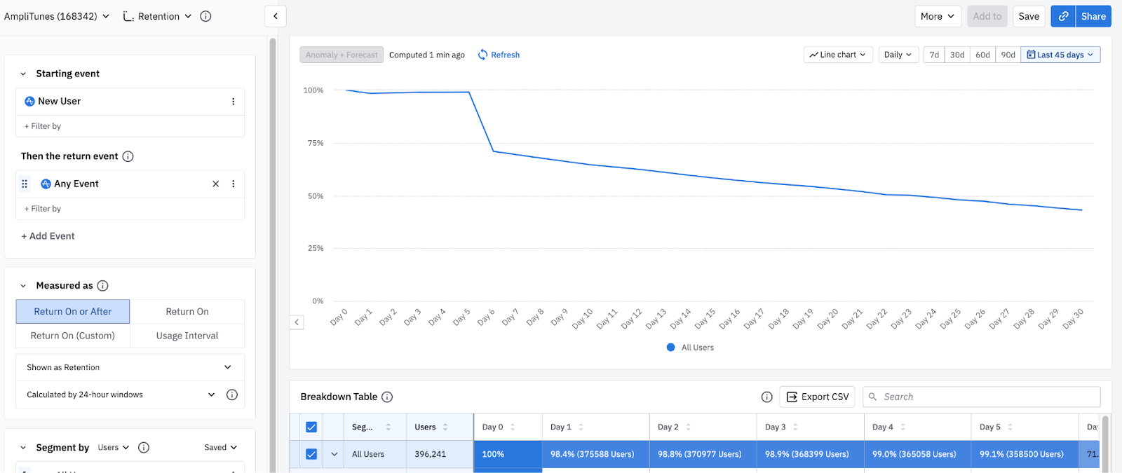 When you first open the Retention Analysis chart, the Return On or After retention graph by default shows retention for new users who returned any event. To see exact percentages, hover over the data point for the day you’re interested in, or click it to inspect the users at that interval (see the Help Center article on Amplitude’s Microscope feature to learn more).