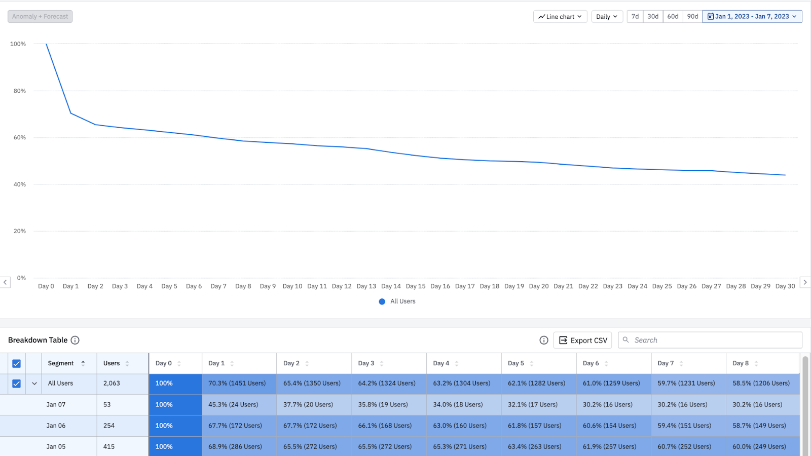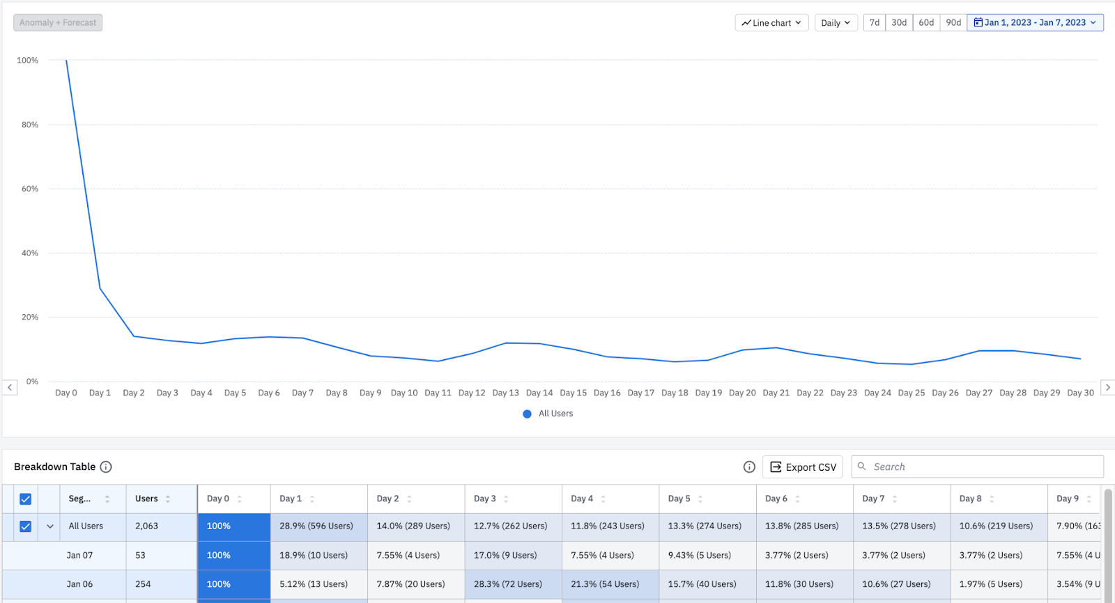 In this chart, we’re looking at all users who were new on January 1st. 100% of them triggered the return event on Day 1, and 72.1% triggered it on Day 7.