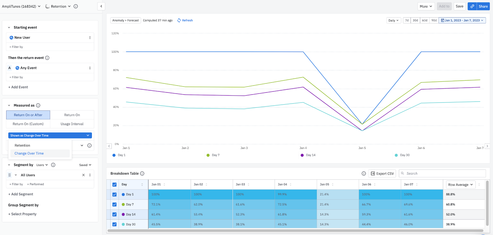 Amplitude also displays a detailed table breaking down the data, broken out by each user cohort and into individual day buckets.