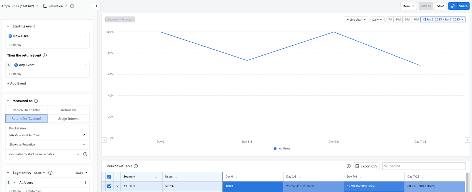 By default, Amplitude assumes you’ll want to use predefined units of time — days, weeks, months, etc. — as retention brackets for your retention analyses. But you can change this by using Return On (Custom) and instead create custom brackets for your Return On retention.