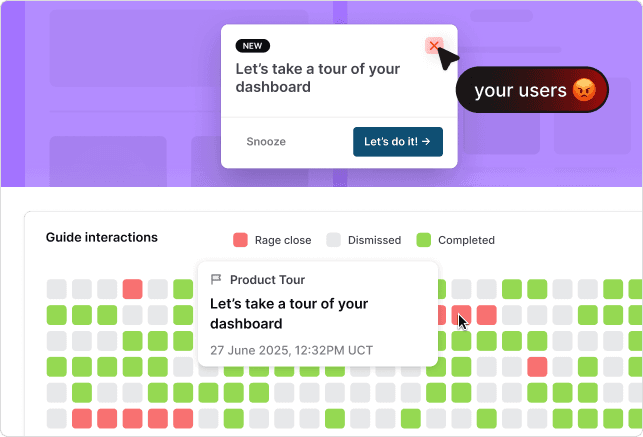 No one wants another annoying popup. Measure user annoyance with your nudges so you can take corrective action and limit how many guides and surveys are shown to users that get less value from them.