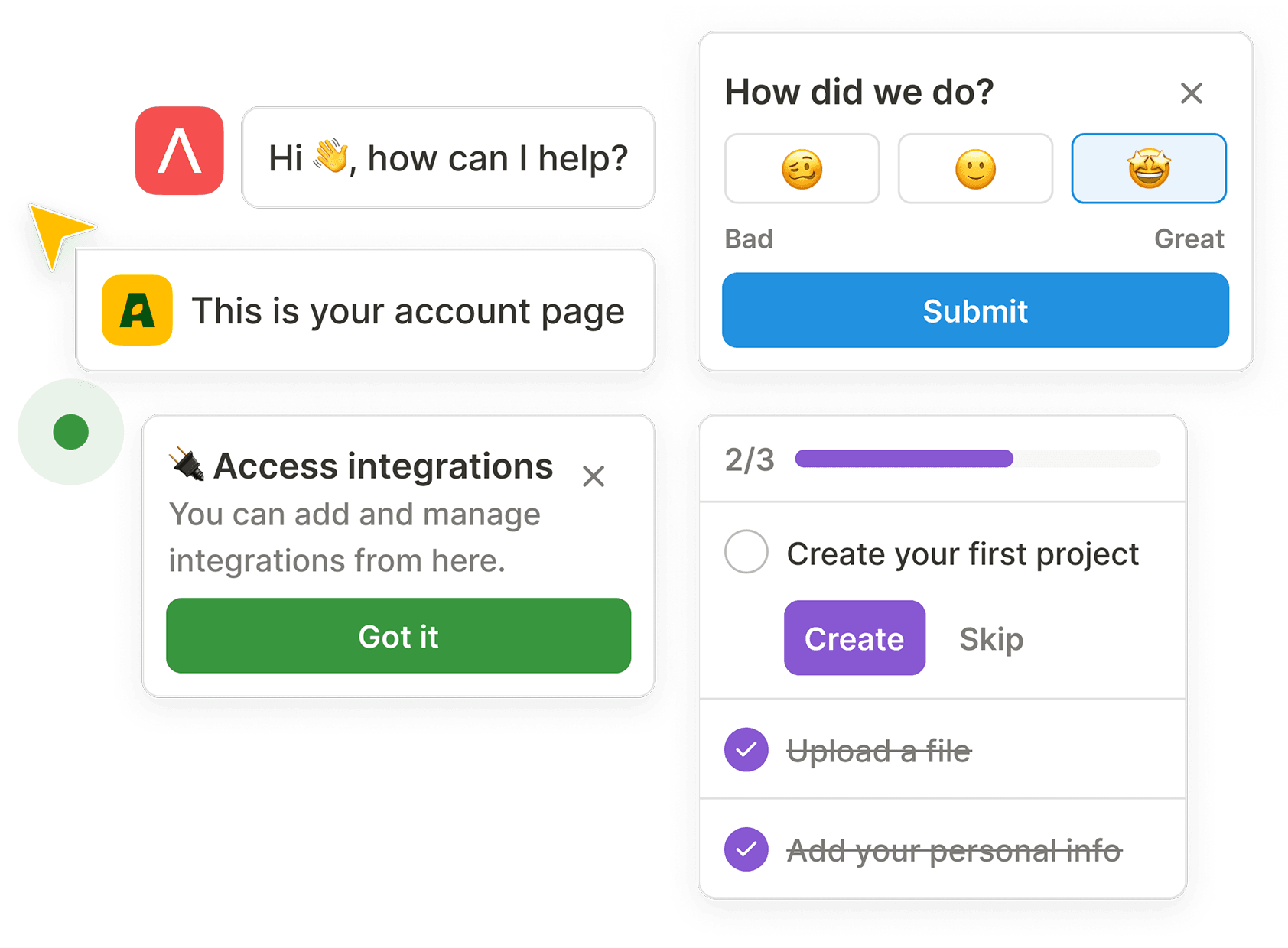We don’t hate the concept, we hate it when it’s done lazily. Guides and Surveys are built to enhance user experiences—not interrupt them. Context-aware guides and surveys show up exactly when they’re helpful and needed, without frustrating your users.