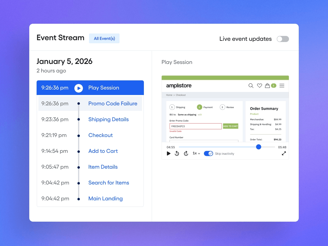 실시간 분석과 시각적 리플레이를 결합하여 사용자 행동을 포괄적으로 파악하세요. 효과적이고 것과 그렇지 않은 것을 고민할 필요 없이 마찰 요인을 정확히 파악하고 경험을 최적화하며 성장을 촉진하세요.
