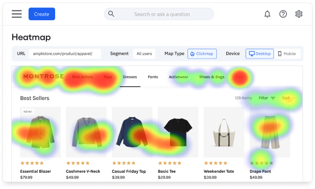 Description: Amplitude’s Heatmapping feature builds on our current Session Replay providing customers with a visual, macro-level view of user engagement. It highlights where users are clicking, scrolling, and engaging most on site or app, helping teams uncover behavioral patterns and trends to make data-driven decisions that enhance product design, content placement, and overall user experience. It automatically generates up to 10 default heatmaps for the highest-traffic pages.