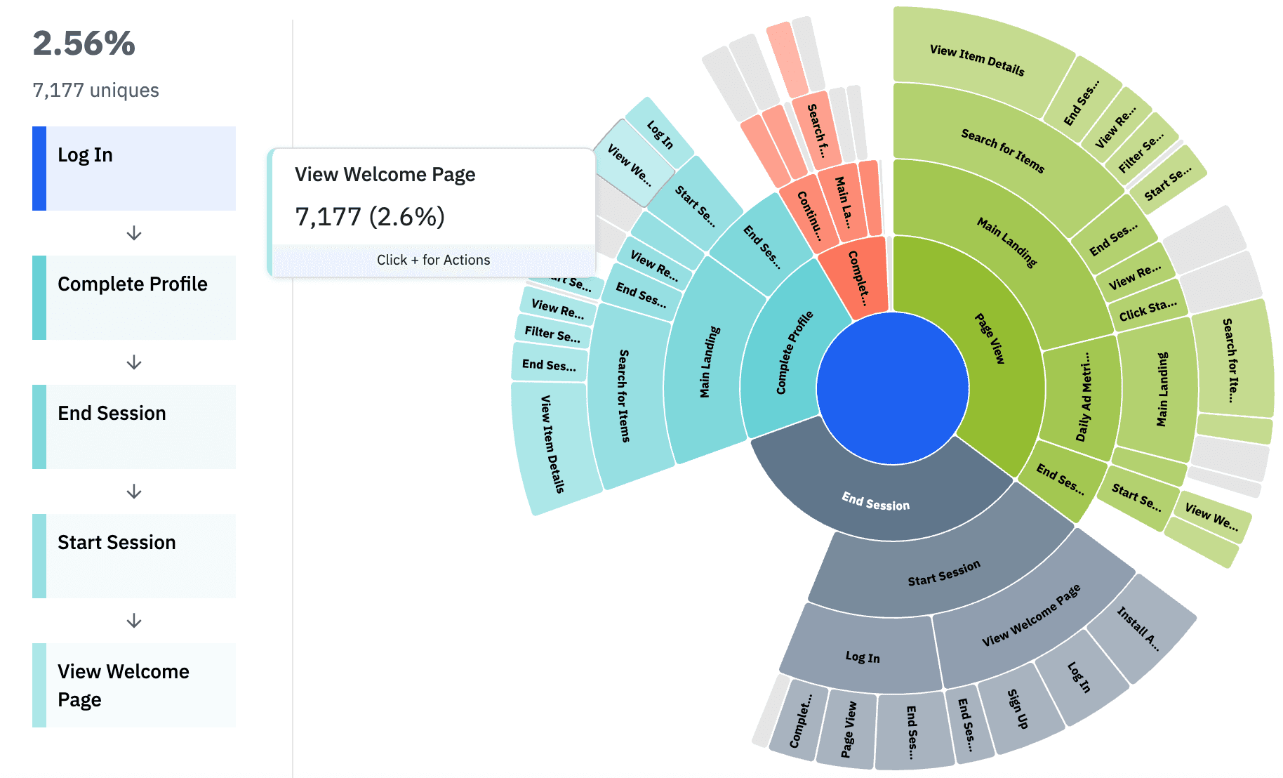 Description: Sunburst adds a compact, radial view of top user paths in Journeys with intuitive drill-down. It simplifies exploration of complex flows and improves storytelling. Multiple competitive EMEA accounts have been asking for this chart format.
