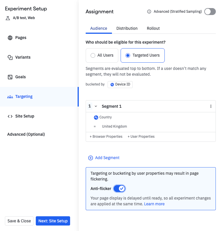 • We automatically update your web experiment's evaluation mode and have a new Anti-flicker setting when the web experiment is using remotely evaluated targeting or bucketing.